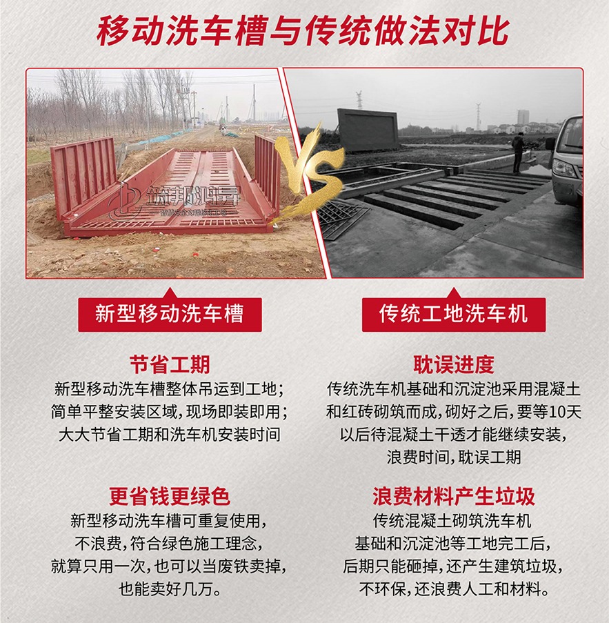 筑邦鴻昇研發的鋼結構移動洗車槽池采用整體設計,整體吊運,用料厚實。替代了之前的工地洗車機下面的水泥基礎,更加牢固方便,節省了大量的基礎砌筑人工和材料,還可以重復使用。如果不需要重復使用;十幾噸重的洗車槽做廢鐵賣,也能賣好幾萬,大大節省了施工時間和成本。鋼結構洗車槽池常規款式有16.6米長和13米長,尺寸可以定制。