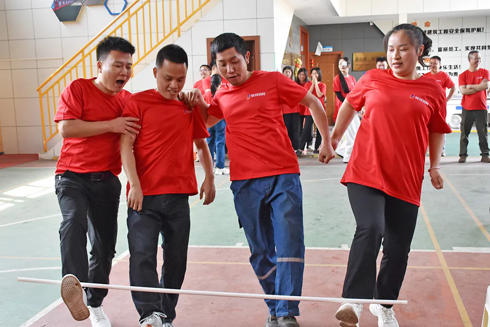 接下來的“勾肩搭腳”接力賽,堪稱爆笑名場面。四人一組或三人一組,搭肩并用一只腳面勾住接力桿前進。這個項目不僅需要身體協調,還考驗團隊成員間的步伐同步。有隊伍剛出發兩秒就集體“癱瘓”倒地,笑聲此起彼伏;也有團隊憑借高度默契和步伐節奏,一路高歌猛進,成為全場焦點。