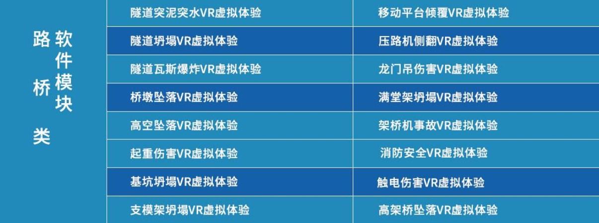 路橋施工軟件模塊主要有支模架坍塌VR體驗、消防安全VR體驗、隧道瓦斯爆炸、隧道突泥突水、觸電傷害、高空墜落、高空作業、基坑坍塌、起重傷害、隧道坍塌逃生等多個VR體驗項目。